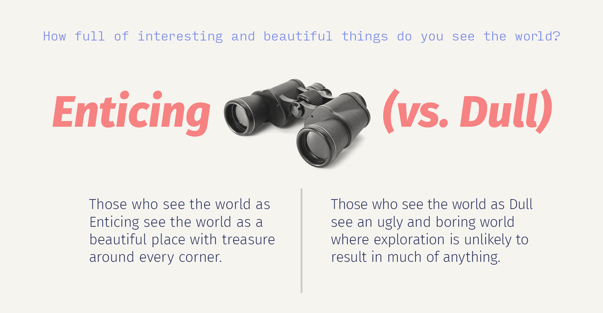 Those low on Enticing world belief see the world as dull. In their view, truly beautiful and fascinating things are rare. Those high on Enticing are of the opinion that treasure is around every corner, in every person, under every rock, and that beauty permeates everything. Therefore, exploration and appreciation are not naïve. It’s simply the rational way to live.