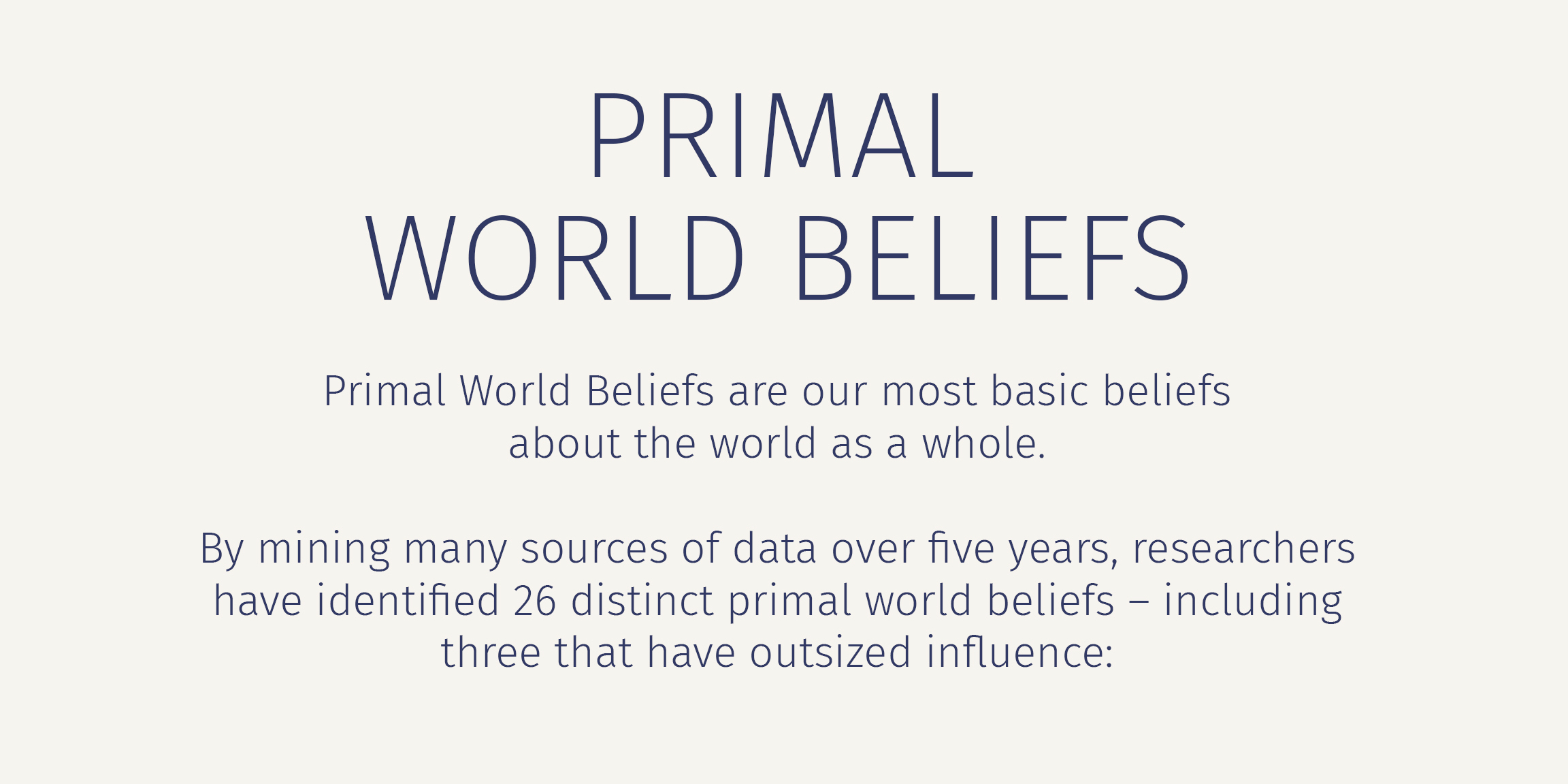 Primal world beliefs, or “primals” for short, are extremely basic beliefs about the world as a whole, such as the belief the world is dangerous.